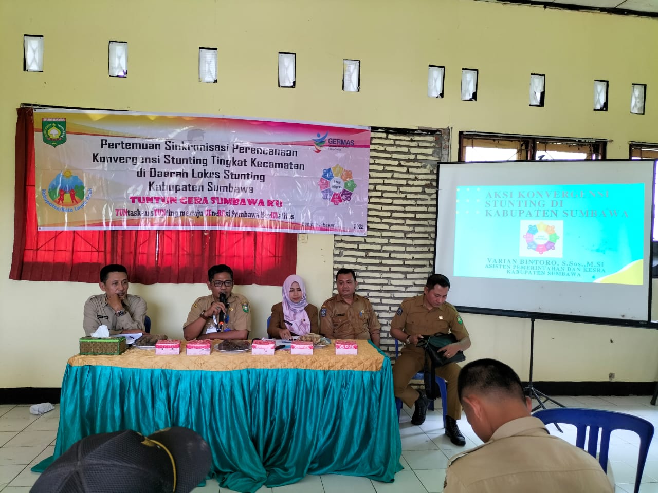 Ikhtiar dalam percepatan penurunan stunting melalui pencegahan dan penanganan stunting di Kabupaten Sumbawa pada tahun 2022 ini dilaksanakan secara konvergen , melibatkan multi pihak dan multi sektor di tingkat kabupaten, kecamatan maupun desa dan kelurahan secara terpadu, holistik, integrasi, tematik dan sistematis melalui 8 aksi konvergensi penurunan stunting. Hasil dari Aksi Konvergensi 1 Analisa situasi dalam aksi konvergensi penurunan stunting Tahun 2021 ditetapkan 6 kecamatan dengan 11 lokus desa untuk intervensi penurunan stunting, oleh karena itu dilaksanakan kegiatan sinkronisasi perencanaan konvergensi penurunan stunting di tingkat kecamatan bersama desa lokus pada Tahun 2022 ini.