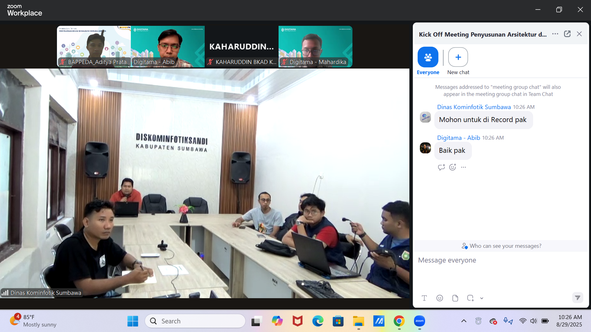 Sumbawa Besar — Pemerintah Kabupaten Sumbawa menggelar rapat koordinasi awal (kickoff meeting) penyusunan Arsitektur dan Peta Rencana Sistem Pemerintahan Berbasis Elektronik (SPBE) Tahun 2025 pada Jumat, 29 Agustus 2025. Kegiatan ini dilaksanakan secara daring melalui Zoom Meeting dan dihadiri oleh jajaran Diskominfotikdansa serta tim konsultan dari PT. Digitama Consulting.
