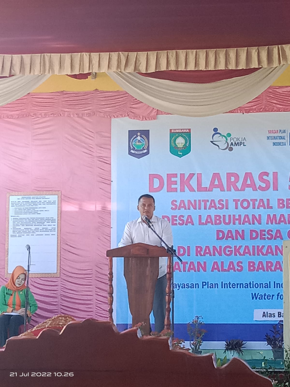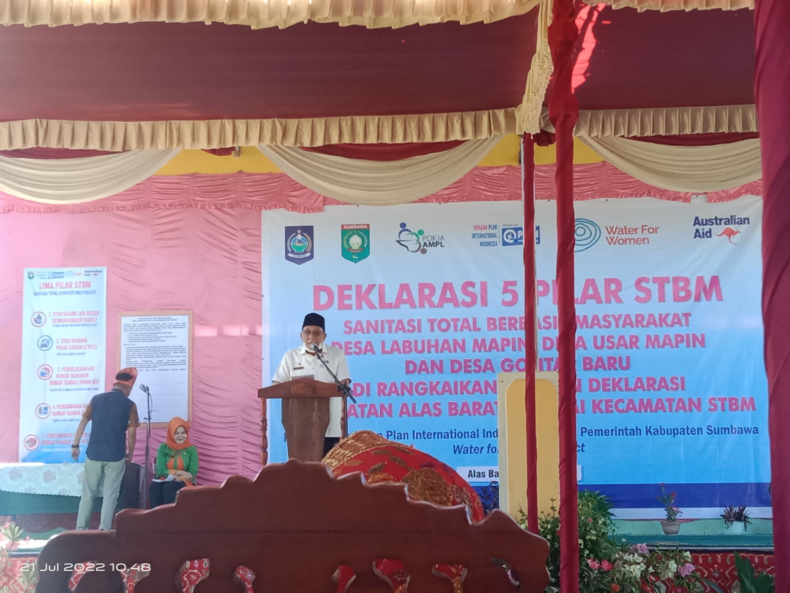 Dalam sambutan dan arahannya Bupati Sumbawa menyampaikan apresiasi terhadap Kecamatan Alas Barat, desa se-Kecamatan Alas Barat, POKJA PKP Kabupaten Sumbawa dan juga YPII atas dukungannya mendorong masyarakat untuk melakukan gerakan masyarakat sehat dan perilaku hidup bersih melalui pendekatan STBM yang berkesetaraan gender dan inklusi sosial, beliau juga menyampaikan harapannya dalam penuntasan 5 pilar STBM di Kabupaten Sumbawa dan mendorong percepatan bagi 16 (enam belas) kecamatan lainnya untuk menerapkan 5 (lima) prinsip STBM dan segera deklarasi Kecamatan sebagai Kecamatan STBM yang akan mendorong pula terwjudnya Kabupaten Sumbawa sebagai Kabupaten STBM.